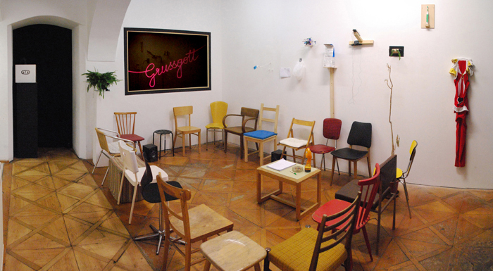 Taking the form of a series of casual conversations mediated through film, or an exercise in film making with austere limits, people the artist knew were invited to drop in during the week of filming and present their mobile phone as a medium on which a piece of the film would be ‘written’. These individual works were made direct onto the invited guests mobile phone, while they waited. At the screening, all the pieces of film made around the script arrived in the pockets of all the participants and were shown in order.