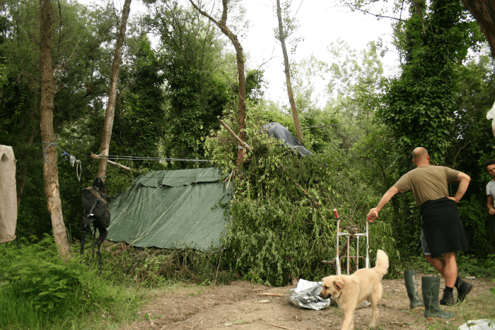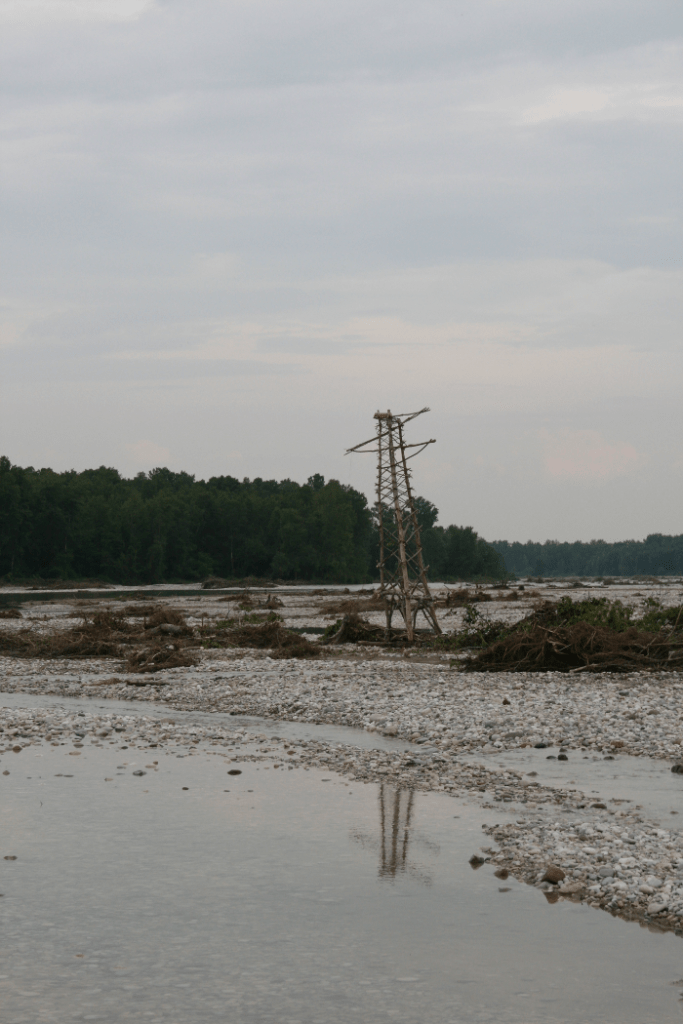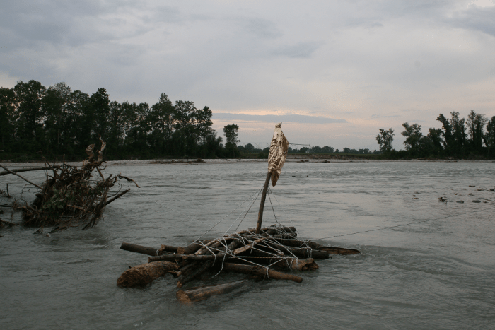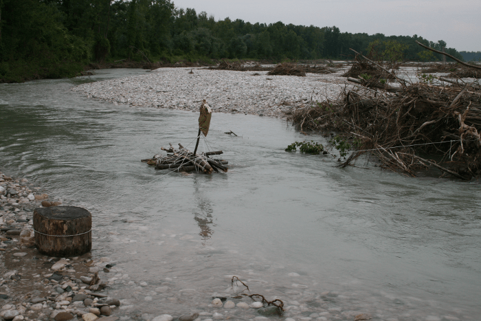 Handhewn with a semi-blunt axe from wood gathered along the recently flooded River Piave in northern Italy, Lightening Tower hung together with wet rope and will power, a piece of WORK.