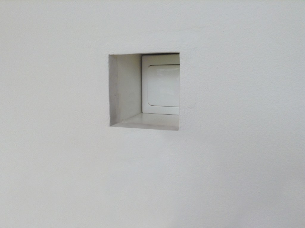 Retreating Switch presents itself in a very quiet way: a simple switch upon the wall, like a normal room fixture. When pressed, it does something it isn’t supposed to do. It moves backwards into the wall.