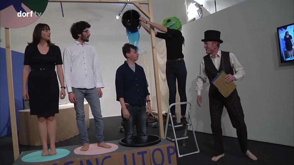 Act 2 showed the TV station as it entered its ‘professional stage’, and followed the station’s progress as it teetered back and forth along a utopic timeline. This part of the performance took place in a stage-like TV station setting, with the live audience watching the goings on live and on TV monitors.